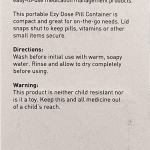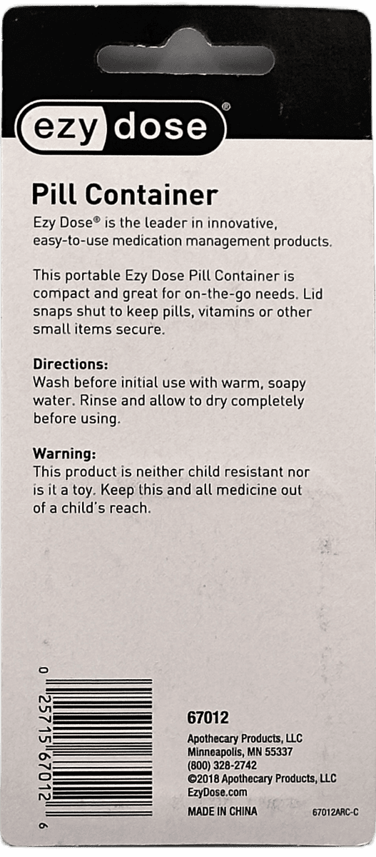 This portable Ezy Dose Pill Container is compact and great for on-the-go needs. Lid snaps shut to keep pills, vitamins or other small items secure.