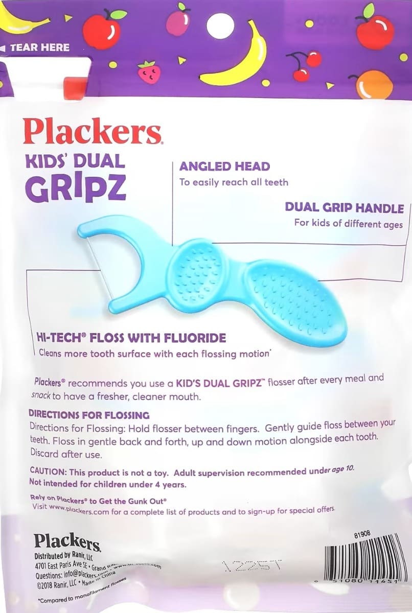 Plackers – Kids’ Dual Gripz – 75 Dental Flossers With Fluoride – Fruit Smoothie Swirl